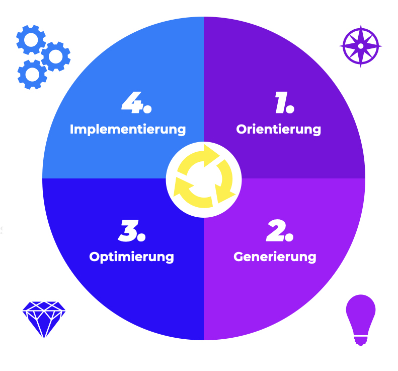 Jede großartige Idee durchläuft einen kreativen Kreislauf: von der ersten Inspiration über die Entwicklung bis hin zur Umsetzung. Klassisch gesehen gibt es vier Phasen: Orientierung, Generierung, Optimierung und Implementierung.